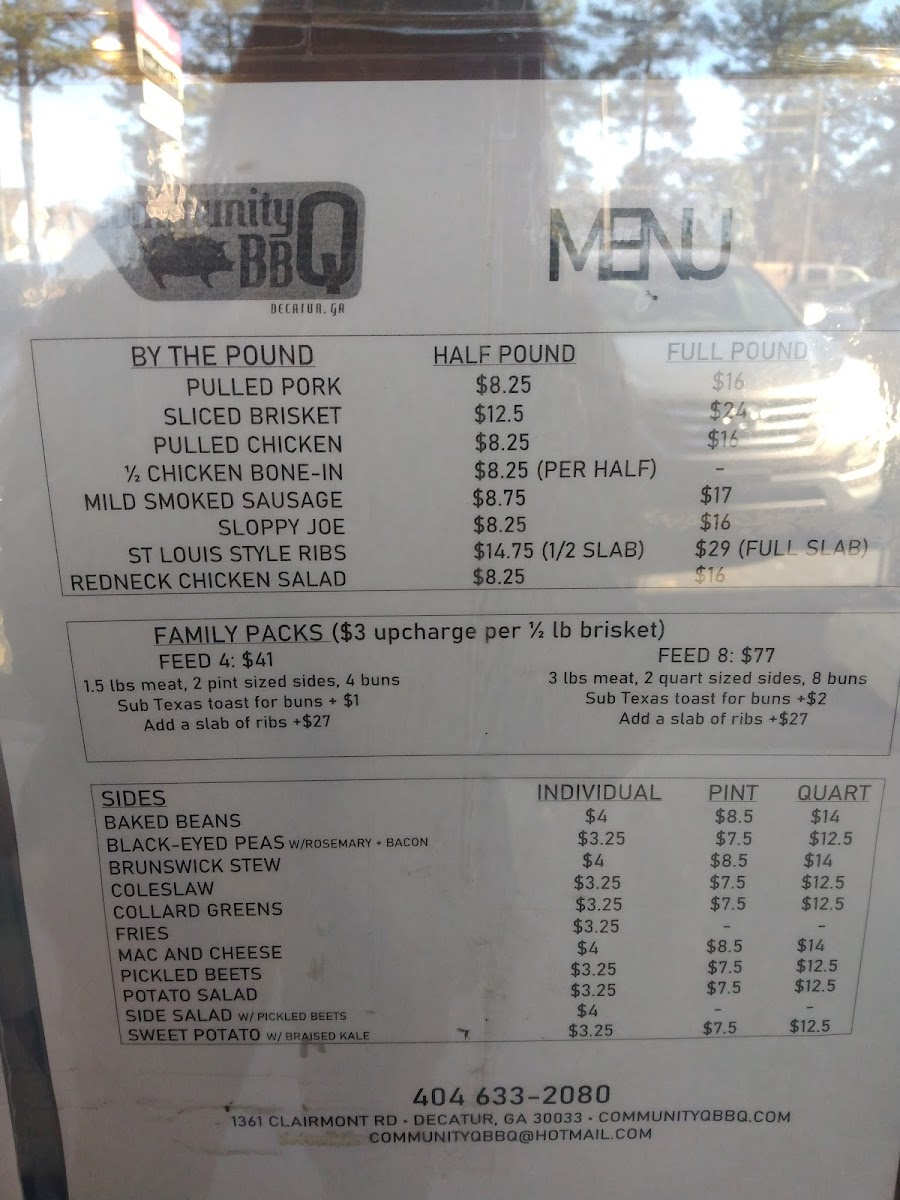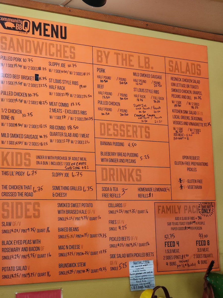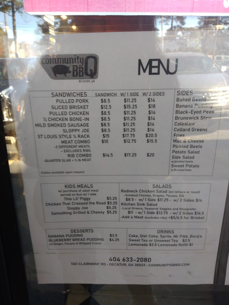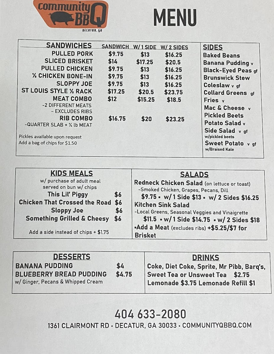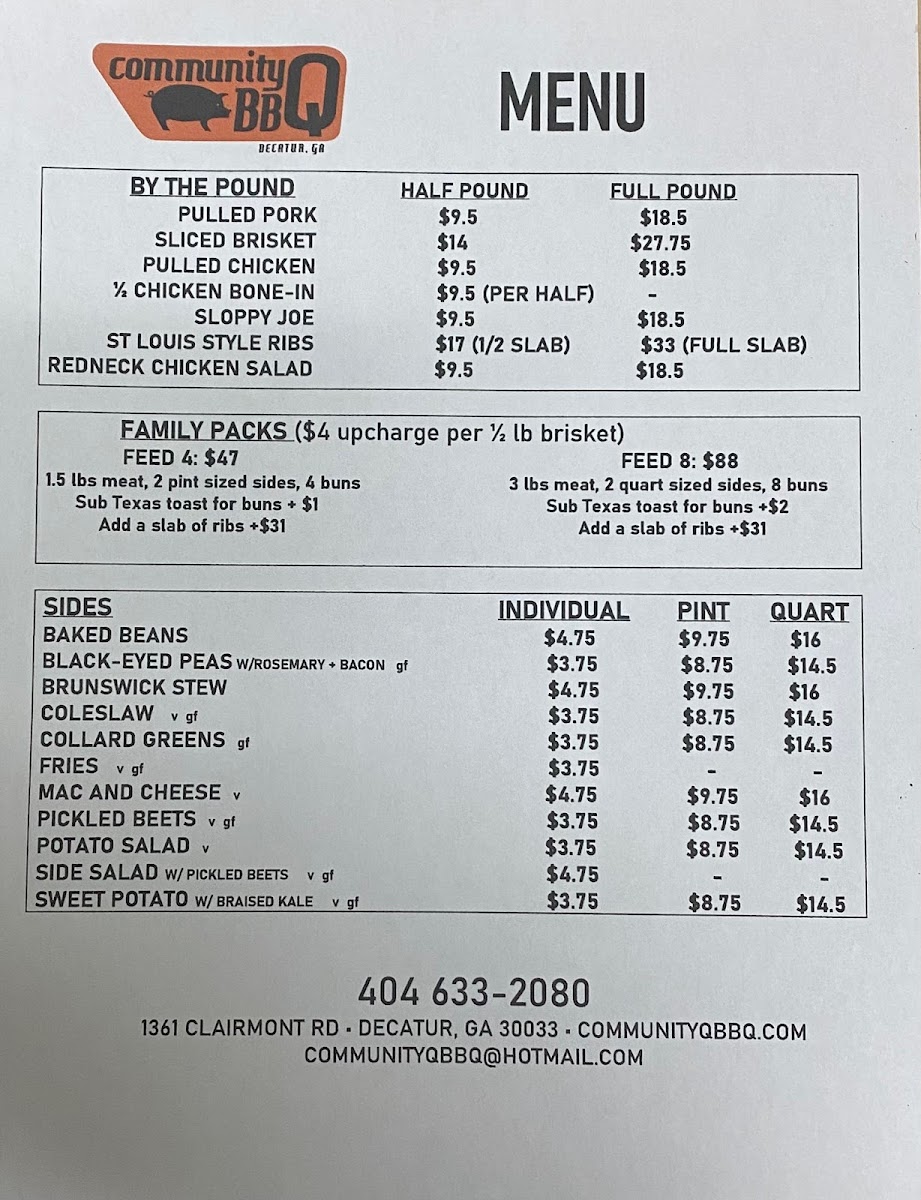 If you're craving some of the best barbecue in Decatur, look no further than the Community Q BBQ Menu. Located at 1361 Clairmont Rd, this local gem serves up a variety of mouthwatering smoked meats that are sure to satisfy any BBQ lover. Whether you’re in the mood for tender pulled pork, juicy ribs, or smoky brisket, there’s something for everyone here. The menu offers a great mix of classic sides too, from creamy mac and cheese to crispy fries, ensuring the perfect accompaniment to your meal. What truly sets Community Q apart is their dedication to flavor - each dish is crafted with care, using the finest ingredients and traditional cooking methods. The next time you're in the area, stop by and dig into some seriously delicious BBQ; it’s the kind of comfort food that hits the spot every time.